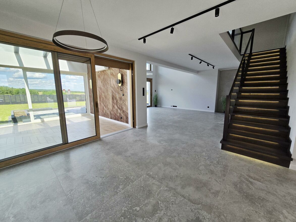Dom składa sie z dwoch poziomów na parterze znajduje sie przestronny salon wraz z jadalnia oraz duzymi oknami przesuwnymi i wyjsciem na ogrod