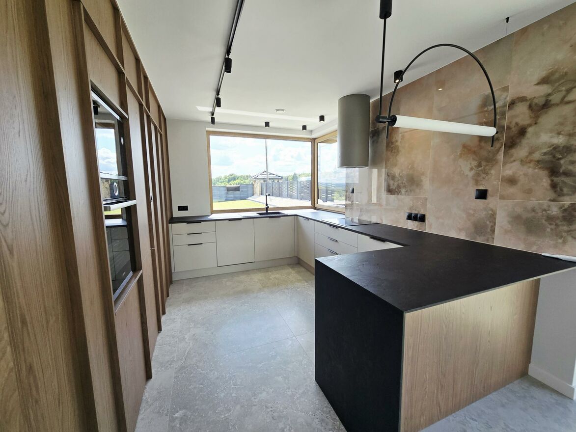Salon łaczy sie z kuchnia wposażona w dobrej klasy sprzeat AGD firmy Bosch oraz spiżarnią Dzieki takiemu połaczeniu uzyskujemy komfortowa strefe dzienne