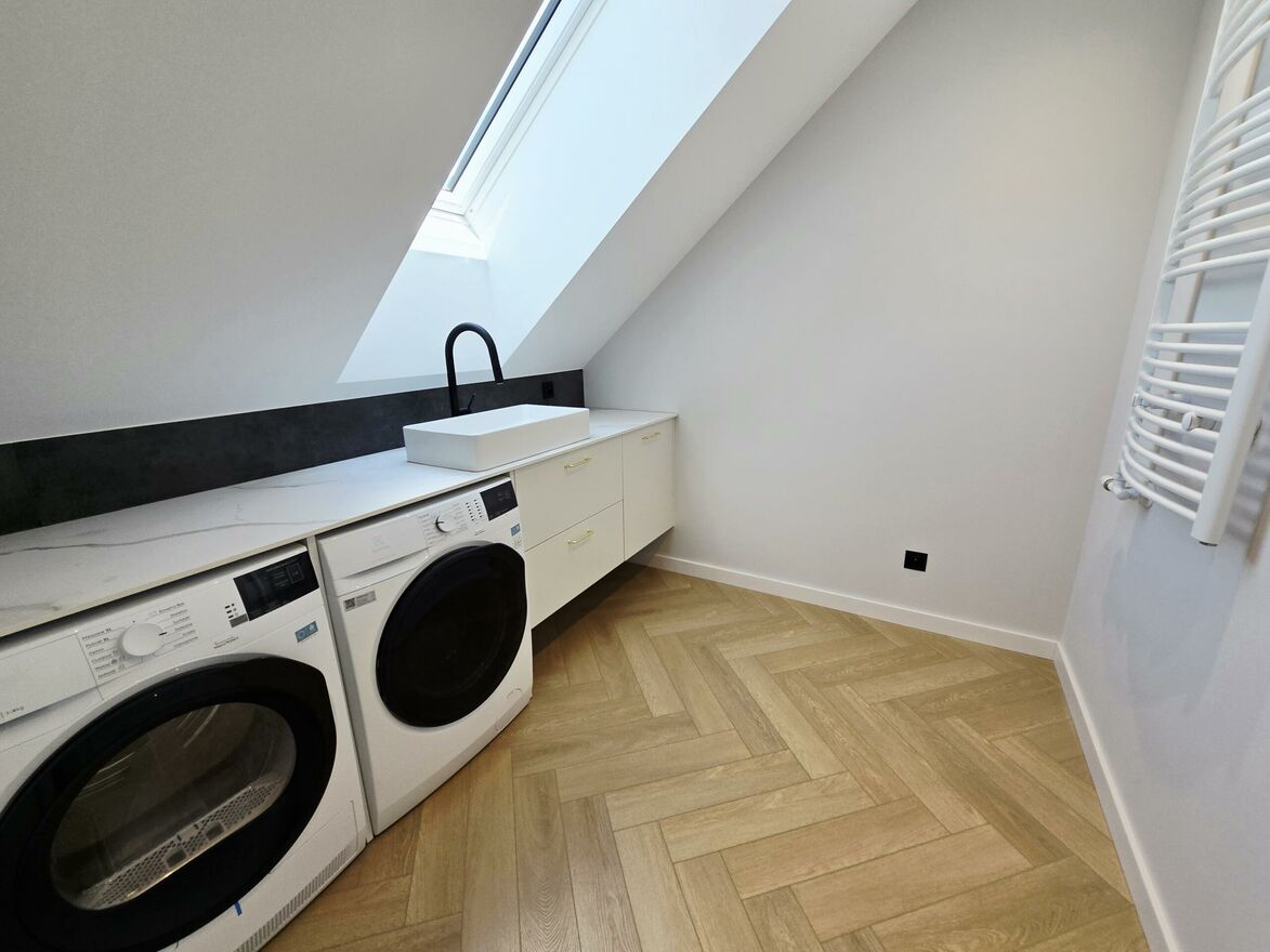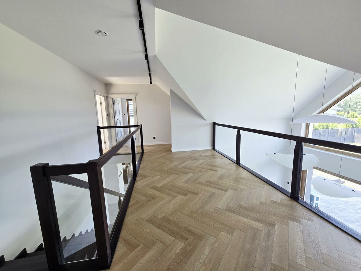Na tym poziomie znajduja sie także pralnia garderoba oraz łazienka wyposażona w wanna oraz prysznic z odpływem liniowym, oraz wygodny korytarz łączący wszystkie pomieszczenia